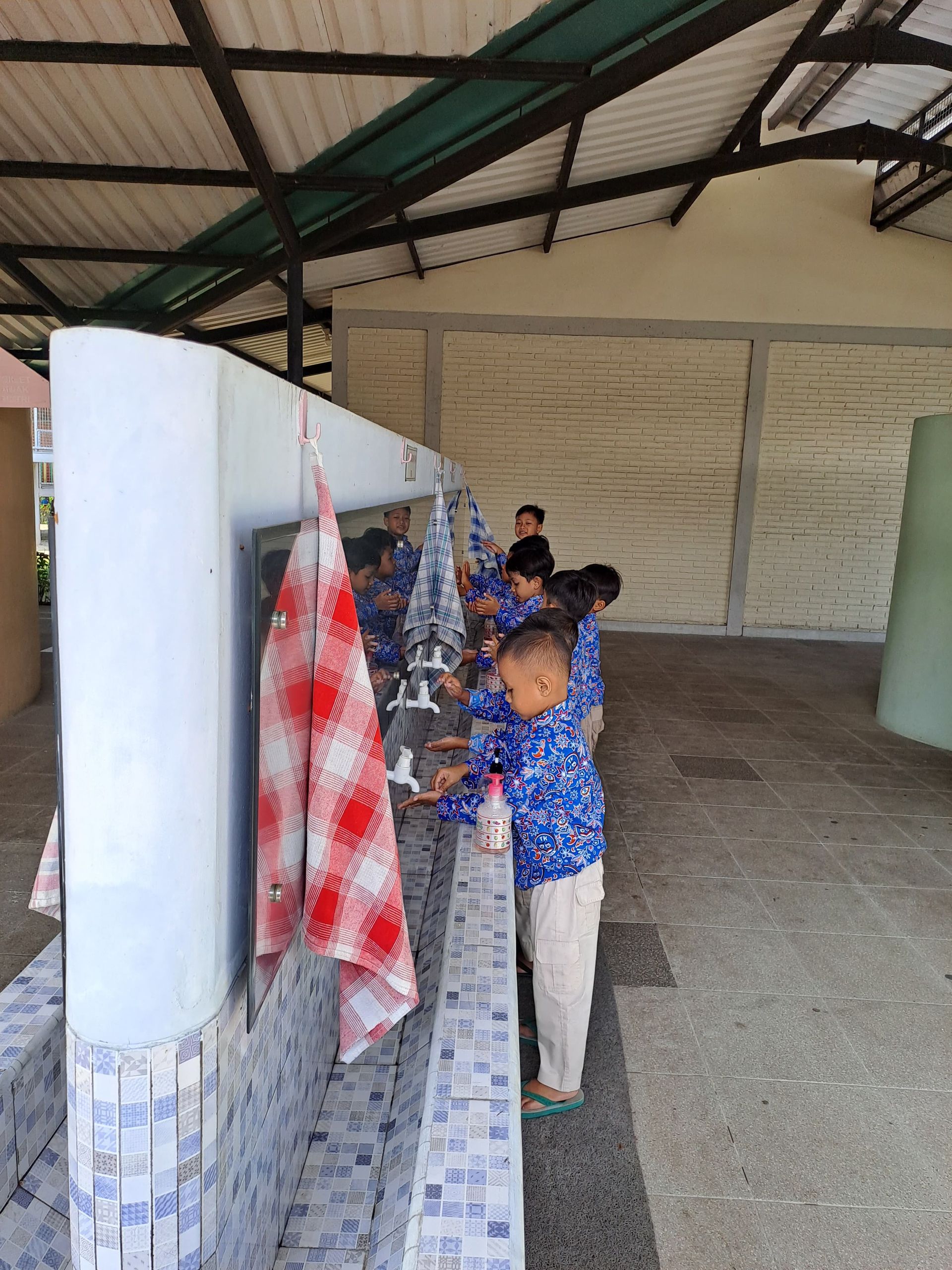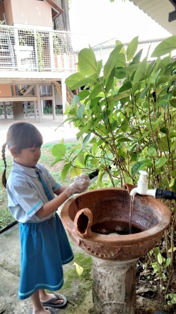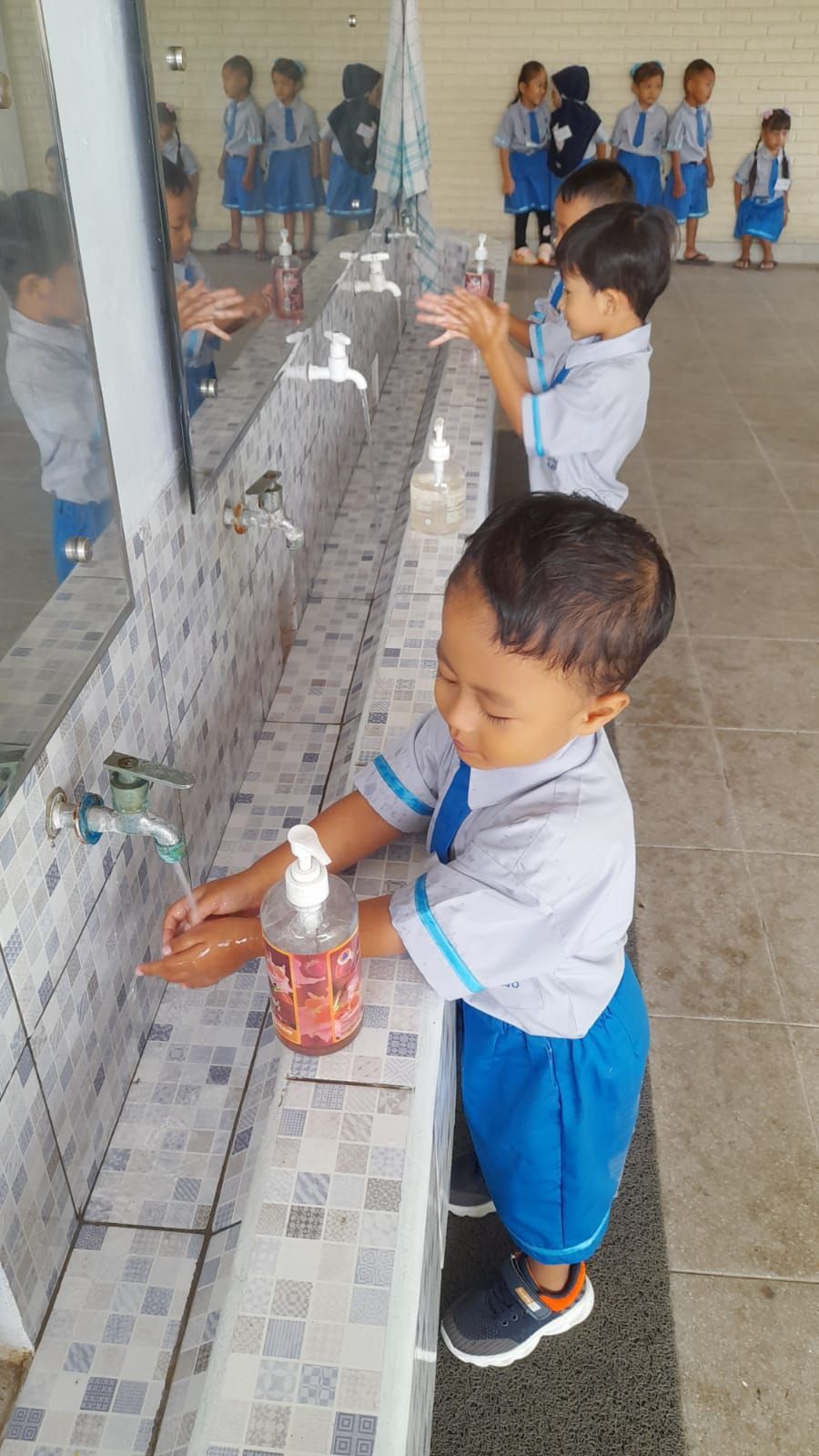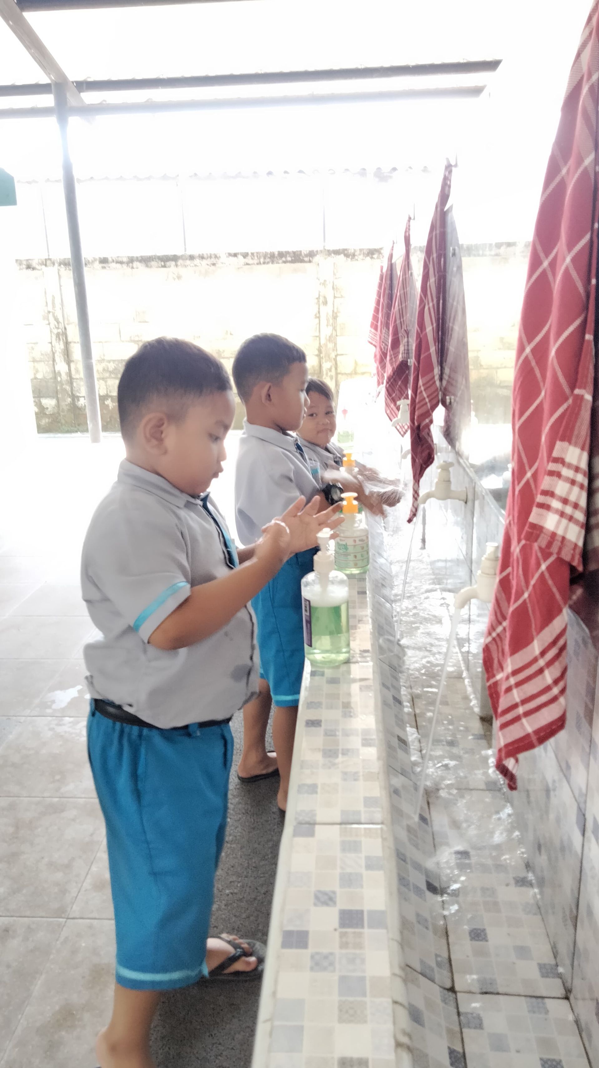 Kegiatan mencuci tangan tidak hanya dilakukan sebagai rutinitas, tetapi juga sebagai proses pembelajaran. Anak-anak diajarkan mencuci tangan sesuai dengan urutan yang benar, mulai dari membasahi tangan, menggosok sabun di telapak dan punggung tangan, hingga membilasnya dengan air bersih. Melalui kegiatan ini, anak menjadi terbiasa menjaga kebersihan diri secara mandiri, dan memahami kapan waktu yang tepat untuk mencuci tangan.